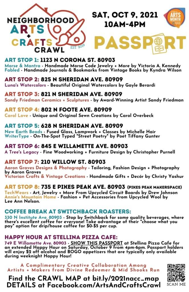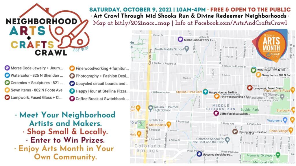To recruit artists/makers, she sent emails, posted on social media, and shared the idea with friends. Soon she had a group of 15 artists that participated in the October event spanning 10 locations in mainly the Divine Redeemer, Patty Jewett, and Shooks Run Neighborhoods. Michelle partnered with the Cultural Office of the Pikes Peak Region for an Arts Month in event 2019 and some of the artists were interviewed by Peakradar and highlighted on their social media pages. A Neighborhood Arts + Crafts Crawl Facebook page was created and the event was highly advertised through social media.
